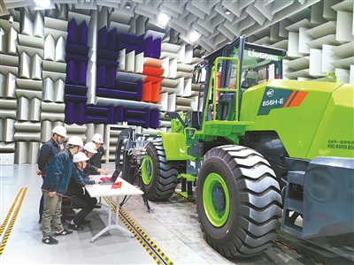 柳工全球研發(fā)中心半消聲實(shí)驗(yàn)室內(nèi),一臺(tái)電動(dòng)裝載機(jī)在進(jìn)行噪聲檢測(cè)。 (廣西柳工機(jī)械股份有限公司 供圖)